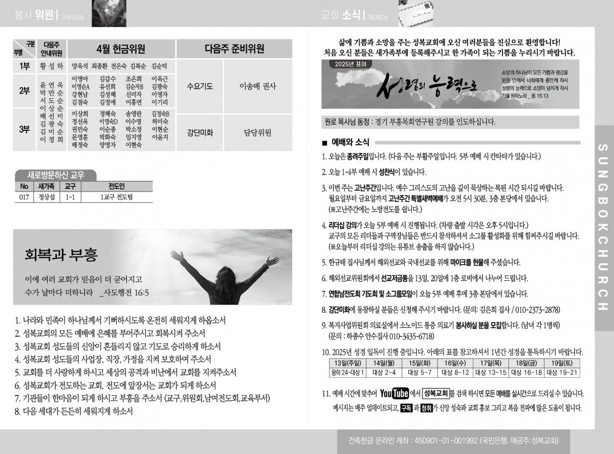 2025 4월 13일 주보 페이지 정보 작성자 최고관리자 작성일 25-04-11 14:06 조회 306회 댓글 0건 본문 이전글4월 20일 주보 다음글4월 6일 주보 목록 댓글목록 0 댓글목록 등록된 댓글이 없습니다.